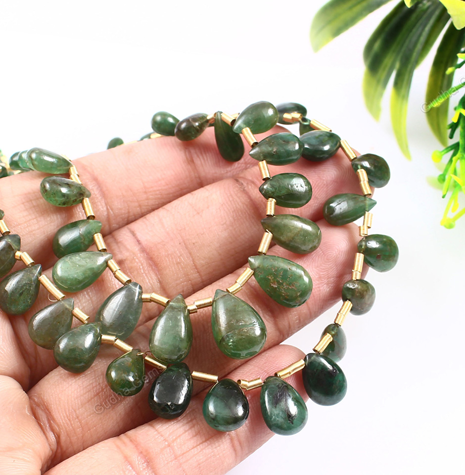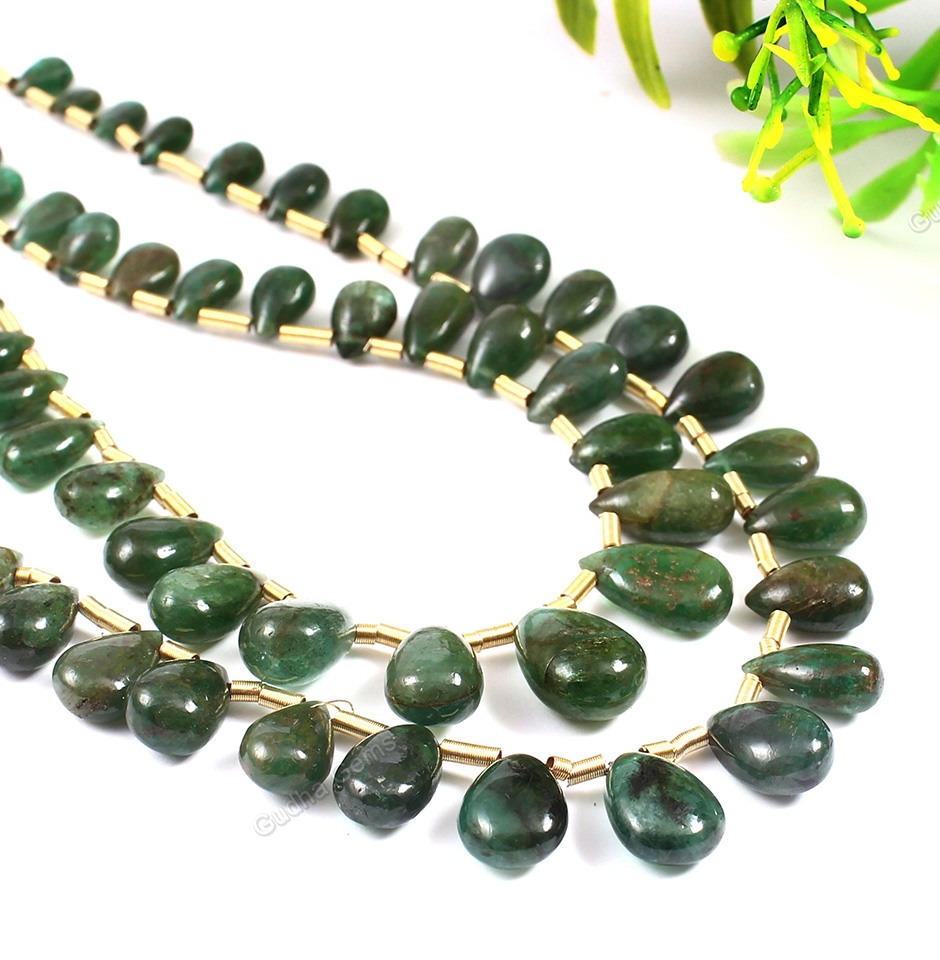 The 105 CRT Unique Zambian Emerald Pear Layout Cabochon with size ranging from 4mm to 9mm width beads is a rare and precious gemstone from the Gudha Gems Company. This exquisite emerald cabochon is sourced from the finest mines in Zambia and has a unique pear-shaped layout that enhances its natural beauty. This particular cabochon has been expertly cut and polished to bring out the gem’s natural beauty. The pear-shaped layout of the cabochon allows it to be used in a variety of jewelry designs, including rings, necklaces, earrings, and bracelets.
