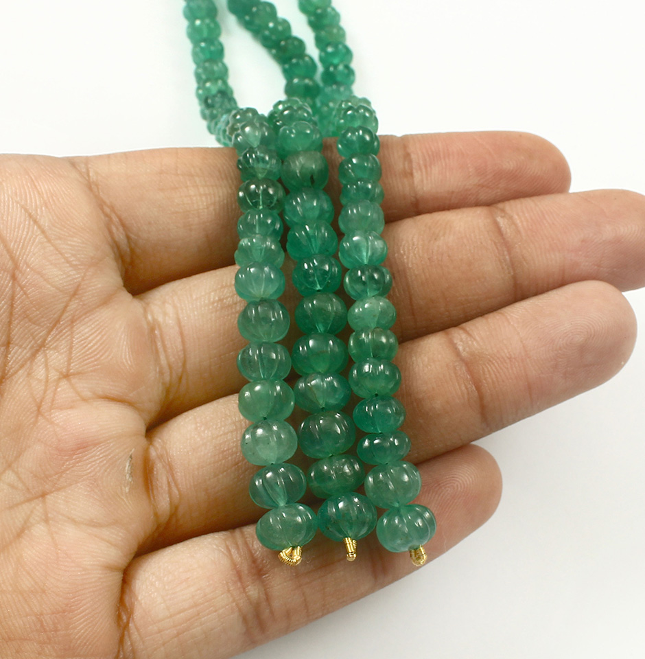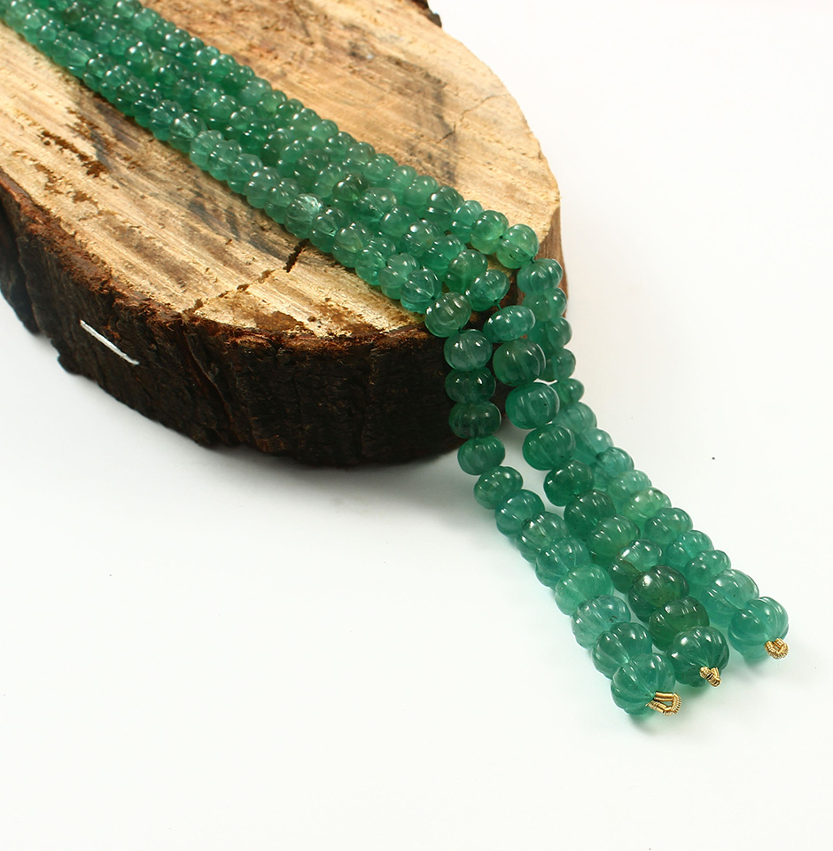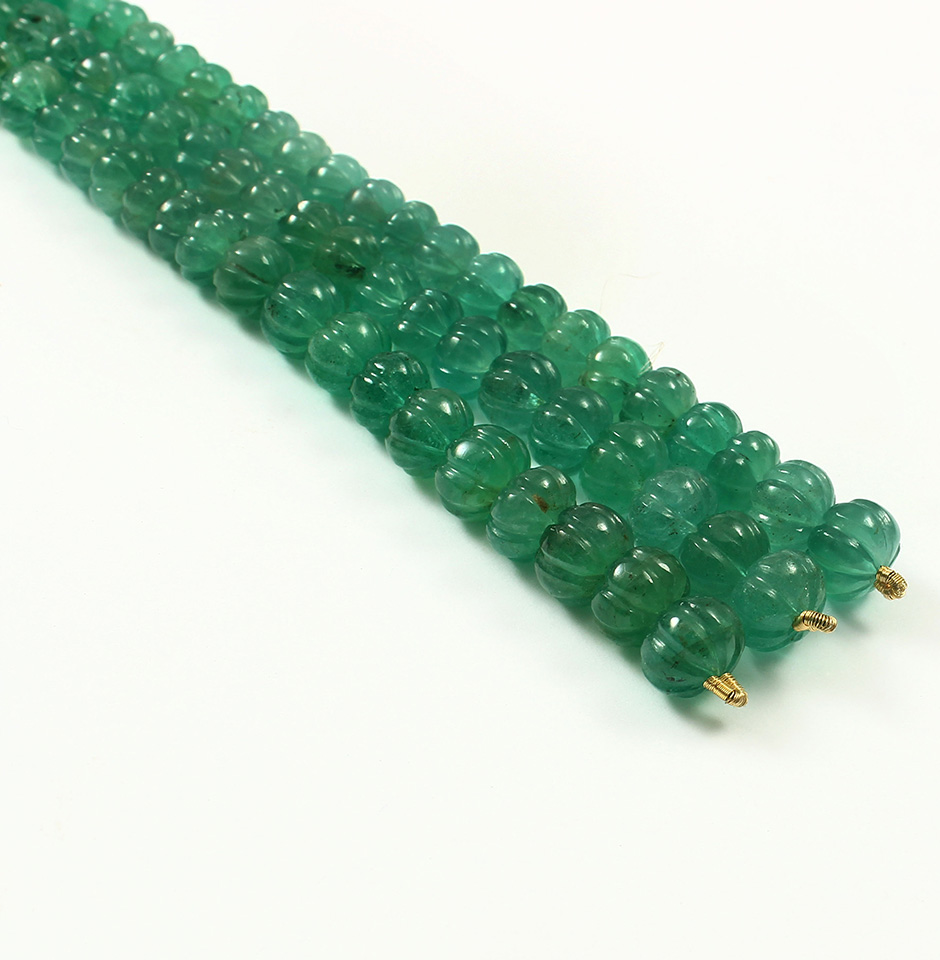 These 55 carat A Grade Emerald Melon Carved Beads are available in sizes ranging from 4 mm to 8 mm. These roundel melon forms have an emerald green colour tone, and Zambia is the emerald's country of origin. It is regarded as the second-largest producer of fine quality emeralds in the entire globe.