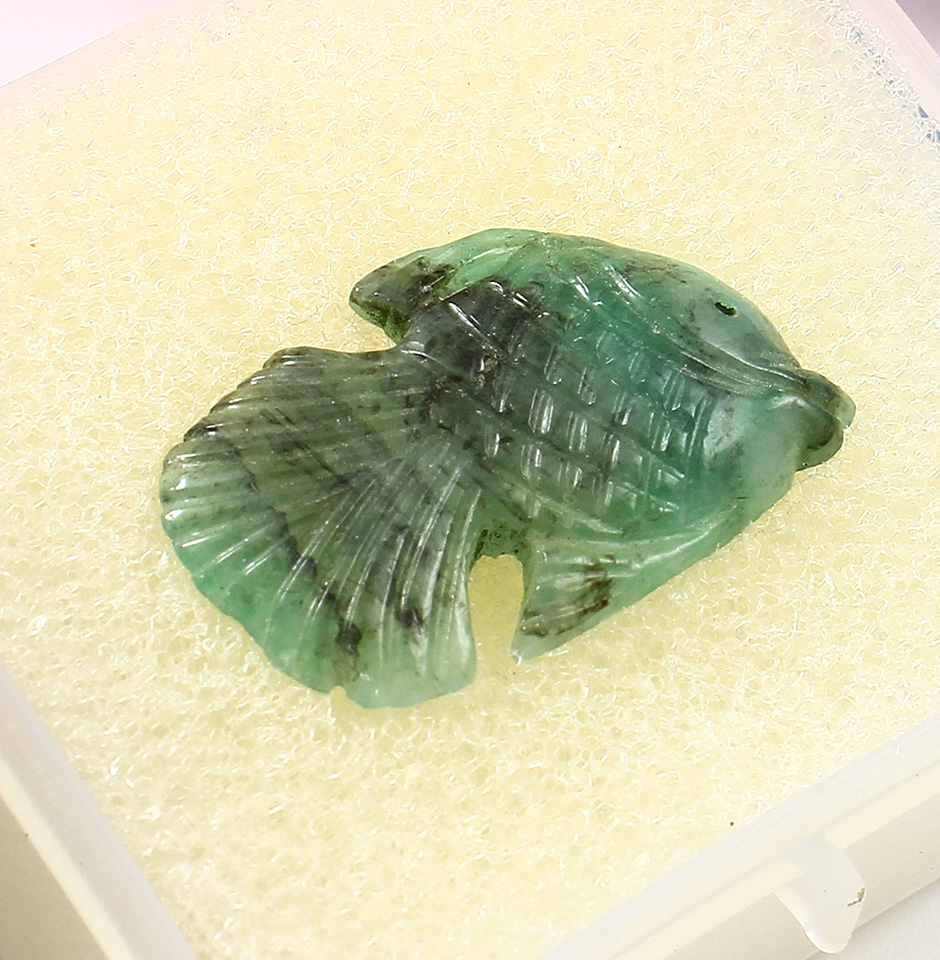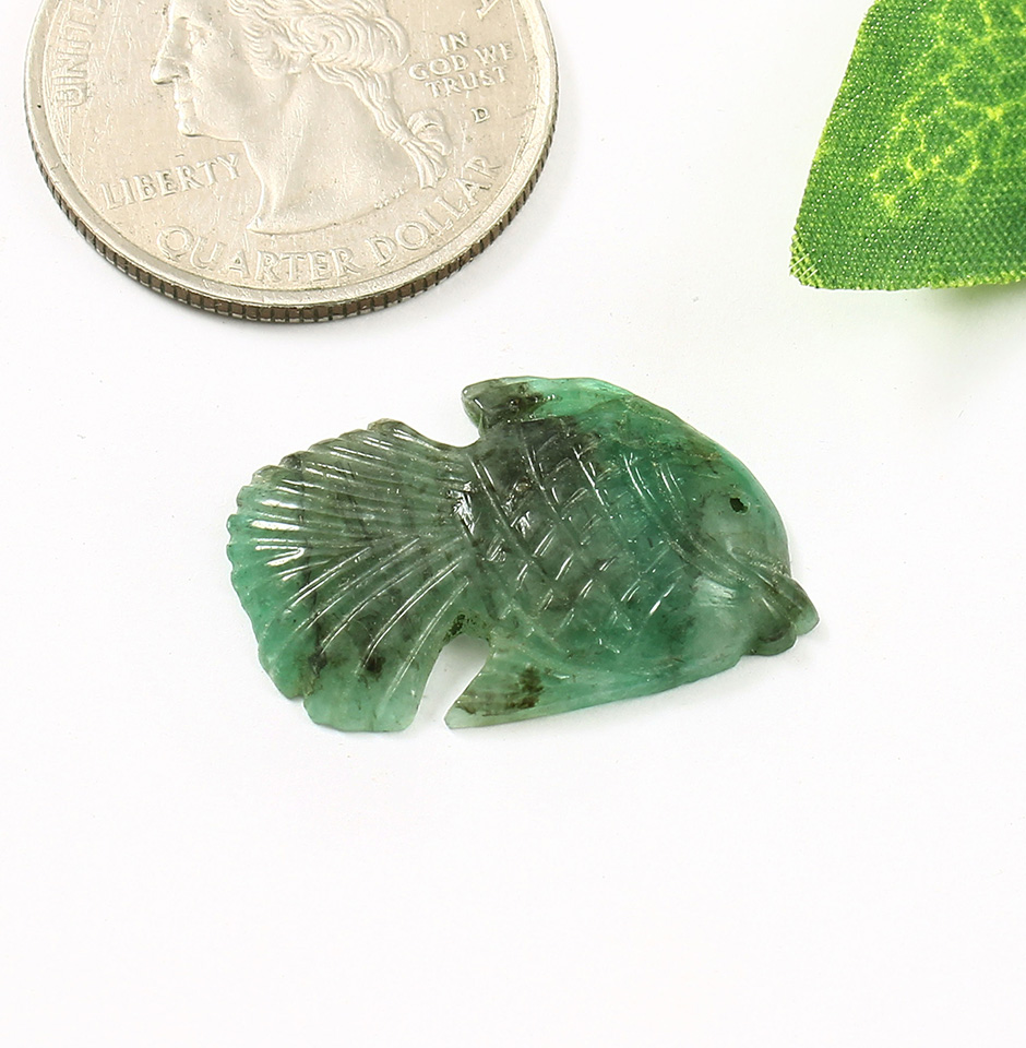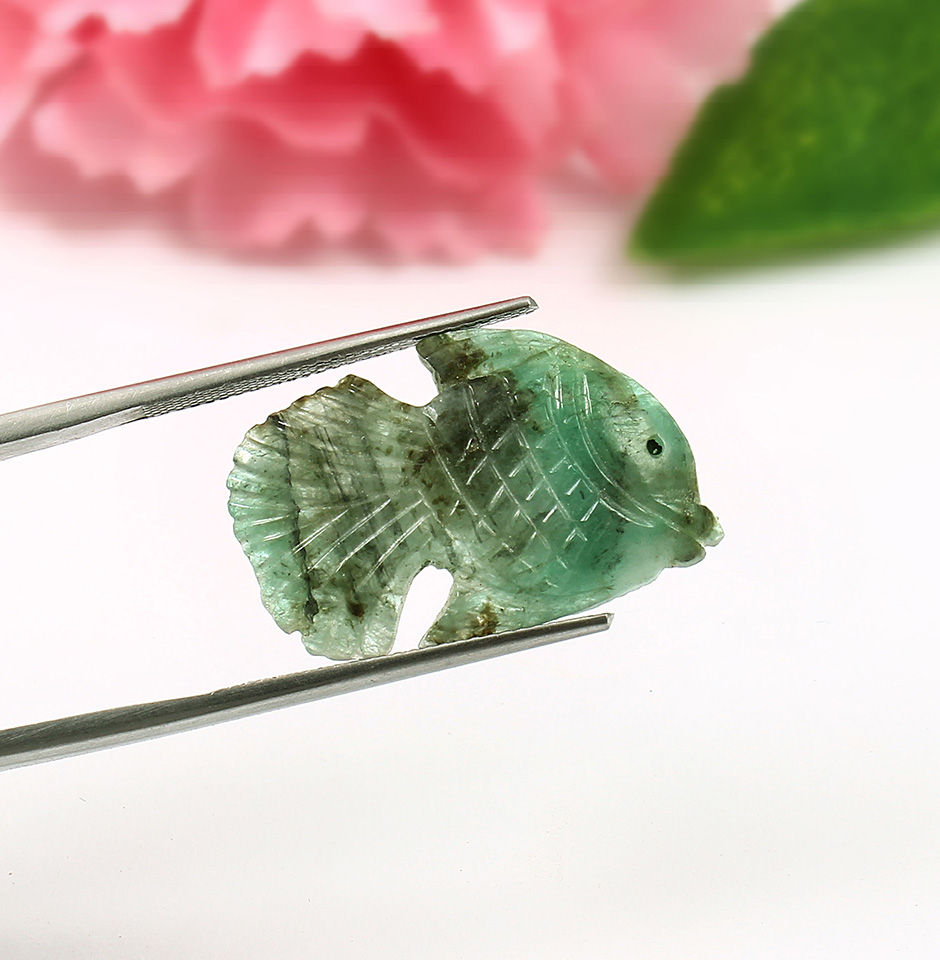 The Antique Fish Shape Carved Emerald Gemstone weighs 9.60 carat. The shade of the gemstone is green and it sizes approx 25x16x3.5 mm. The emerald is mined from Zambia. The Zambian emerald is famous across the world for its outstanding appearance and superior quality. They include fewer inclusions and are shorter. Zambian emeralds have been one of the most important geological discoveries in recent history. The Jaipur artisans hand-carved this antique jewel. Clear carving brilliance could be seen on the emerald cut into the shape of a fish. We provide you products that are well regarded all over the world as a wholesale gemstones dealer in Jaipur by obtaining the stones from the greatest collection.