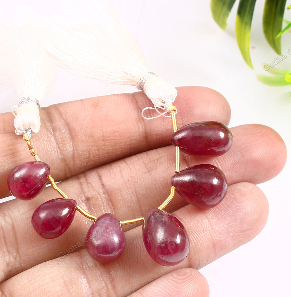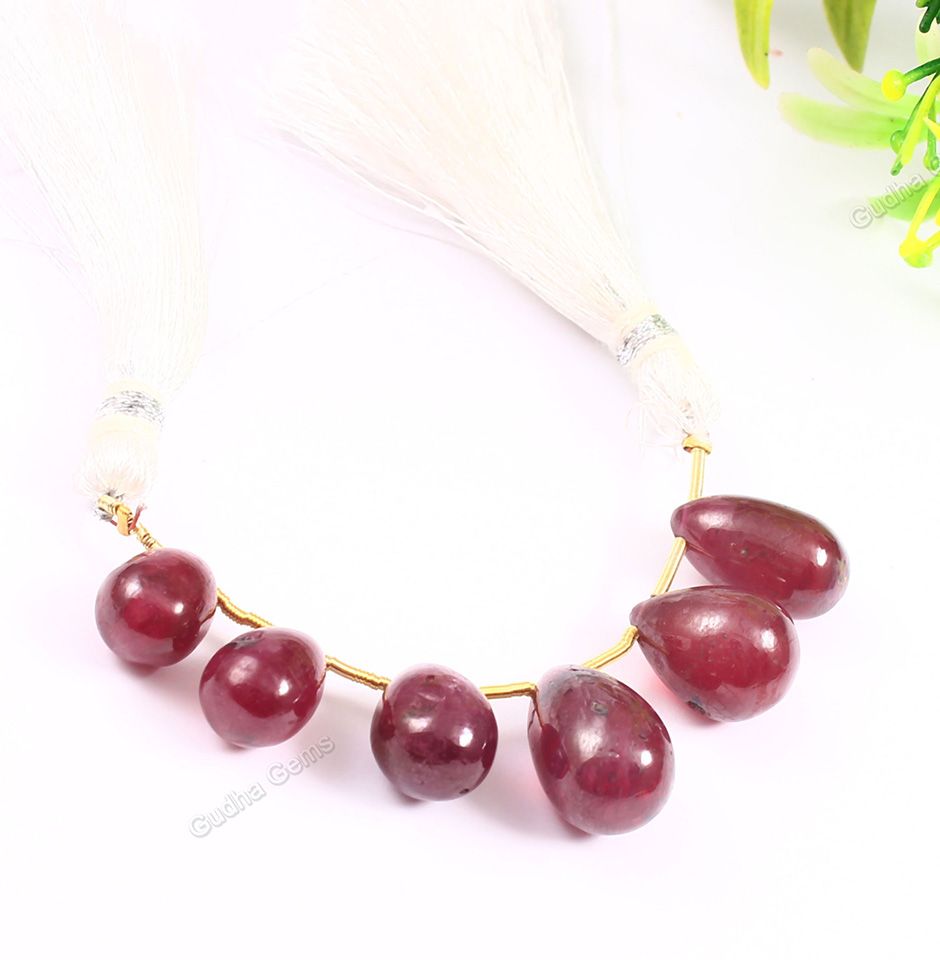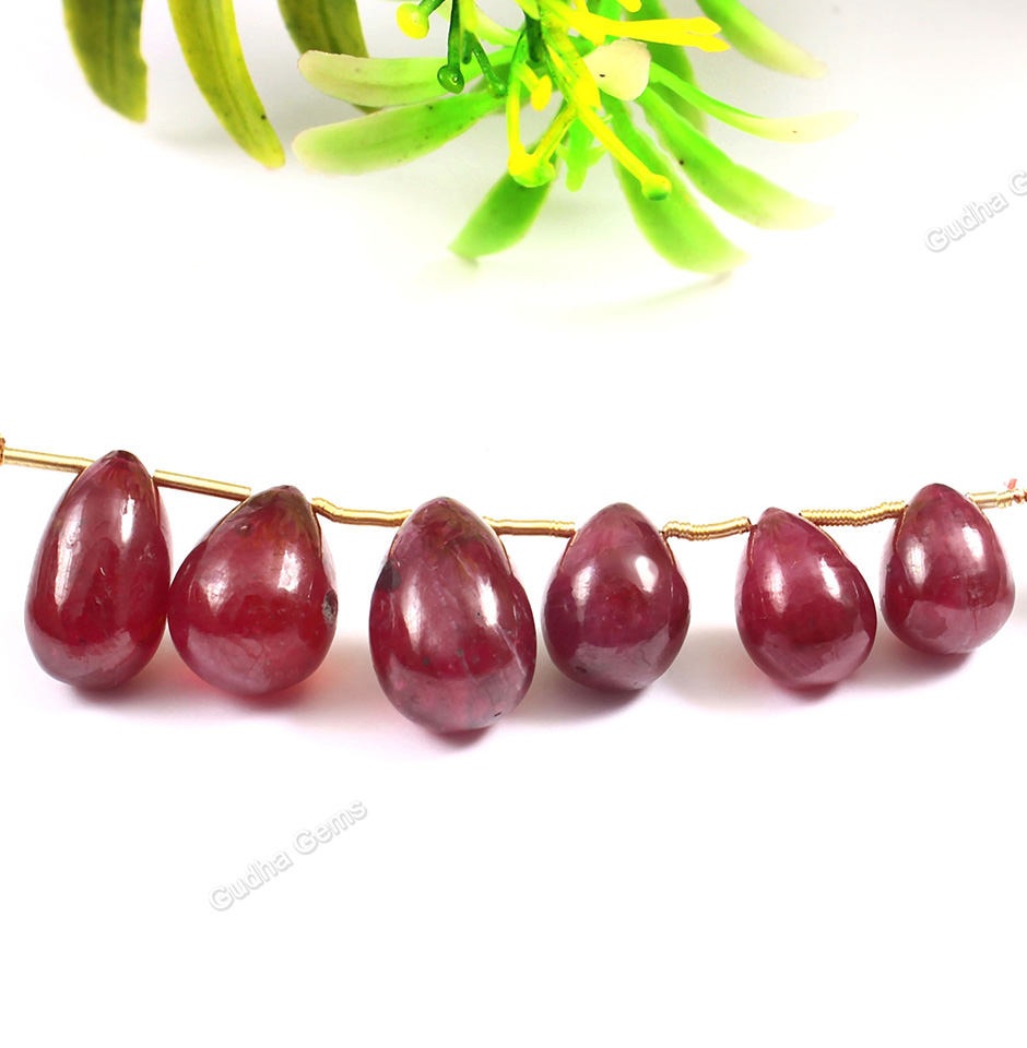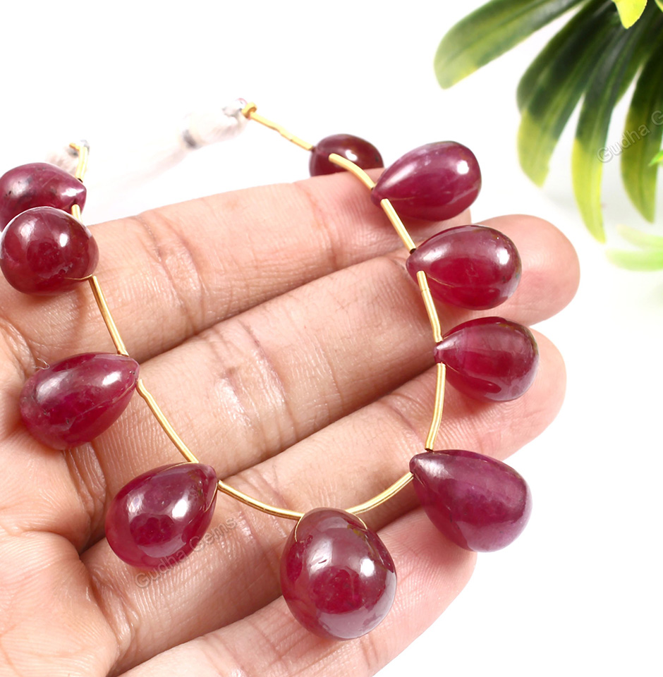 These deep red teardrop beads, which are from Bangkok, range in size from 9 to 14 mm and weigh 162 carats. There are many different sizes and colours of teardrop beads. These hand-carved teardrop shapes exhibit the carvers' talent and give off a unique charm. Gudha Gems is offering these Beads at a discount. We promise that you will receive the best-quality beads available, created from the finest rubies that can be discovered in naturally occurring mines. We are a wholesaler in Jaipur.