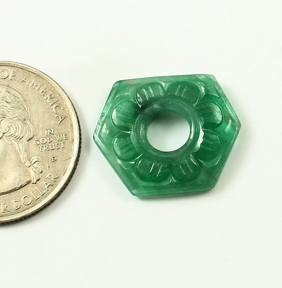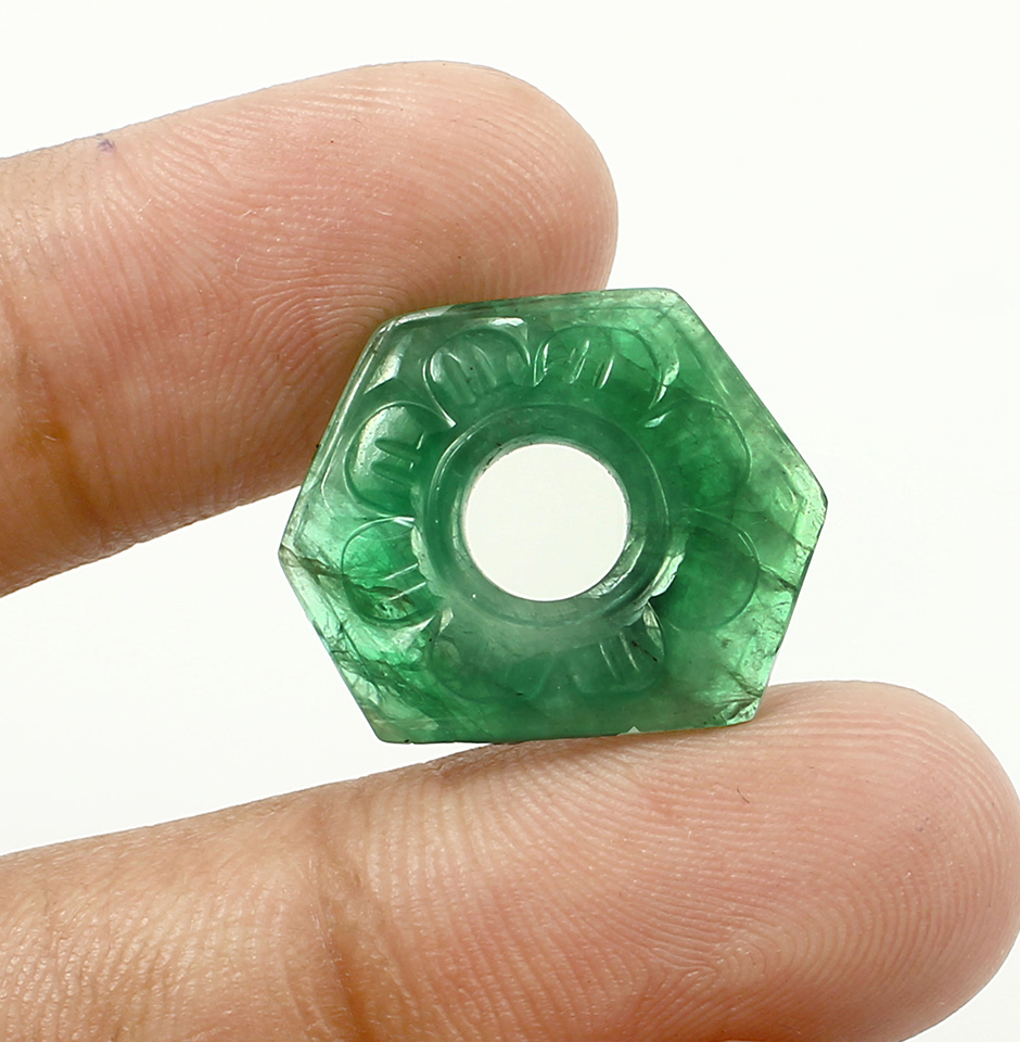 The Emerald Coin Carving is of 10.33 Carat weight and is of green shade. The size of this carved stone is nearly 17.5mm x 18mm x 5mm. The origin of gemstone is marked from Zambia. Emerald is said to make the wearer happy and healthy. For the most precise jewellery in the world, our skilled gemologists selected this outstanding Emerald Fancy Cabochon with fine colour, cut, and clarity directly from the mines of Zambia. It boasts superb colour, cut, and clarity and is of high quality and polish. We provide the best materials possible to our customers as a gems dealer in Jaipur. When offering the services we do, we never compromise. We are aware of how important it is to make informed decisions while purchasing gemstones.