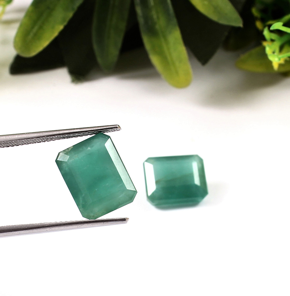 Introducing the exquisite Emerald Cut Emerald Pair from Zambia, exclusively designed and crafted for Gudha Gems Company. These gemstones are a true reflection of nature's beauty and artistry, and are sure to captivate anyone's heart.With a total carat weight of 12.9 carats, this pair of emerald cut emeralds boasts a rare and unique colour that is difficult to find anywhere else. The opaque aqua green hue of these emeralds is truly one-of-a-kind, and is sure to make a statement when set in any piece of jewelry.Each gemstone measures 12 x 9 x 6 mm, making them the perfect size for a variety of jewellery designs. Whether you are looking to create a stunning pair of earrings, or a breathtaking necklace, these emerald cut emeralds are the perfect choice.The emerald cut of these gemstones is another unique feature that sets them apart from other gems. The rectangular shape with cut corners highlights the beauty of the gemstone, allowing it to sparkle and shine in any light.