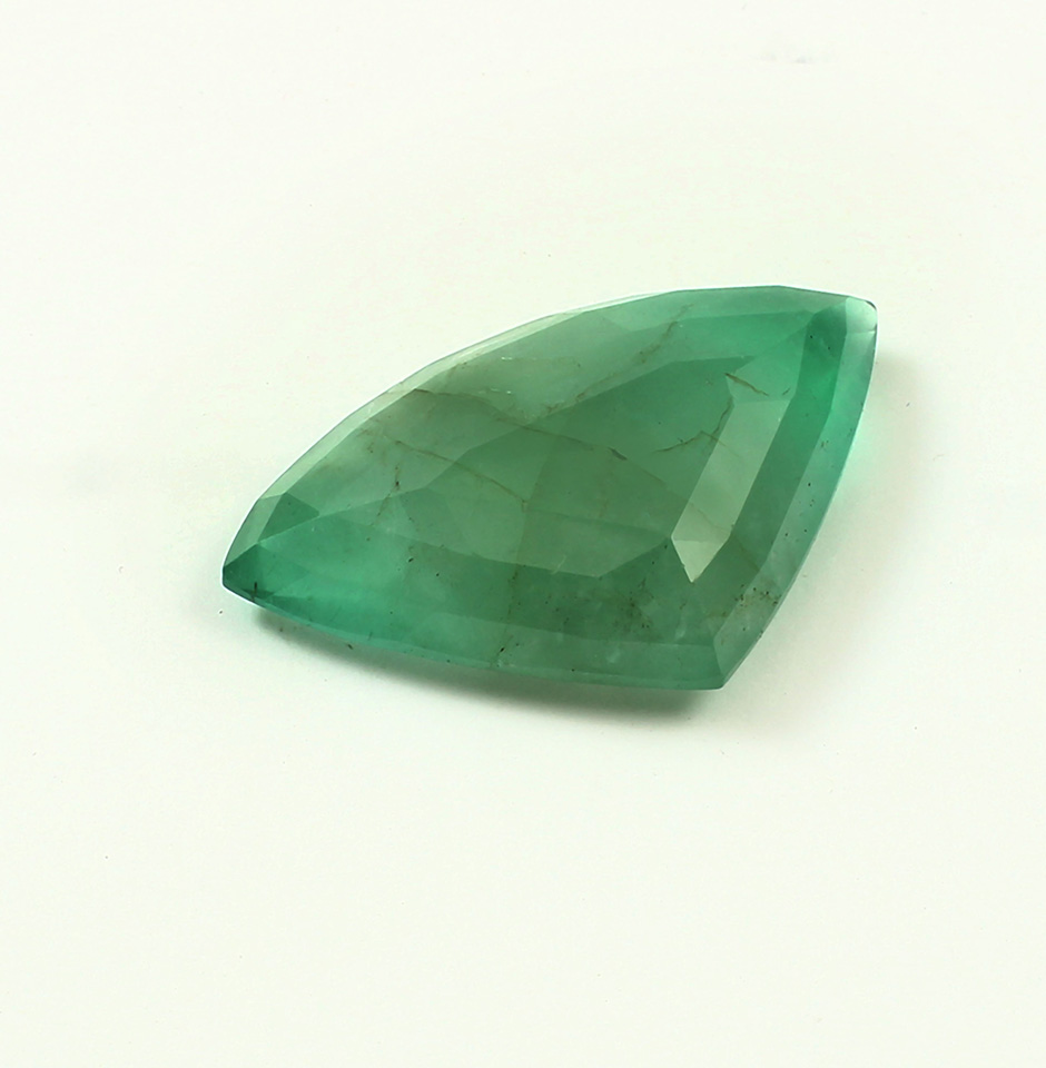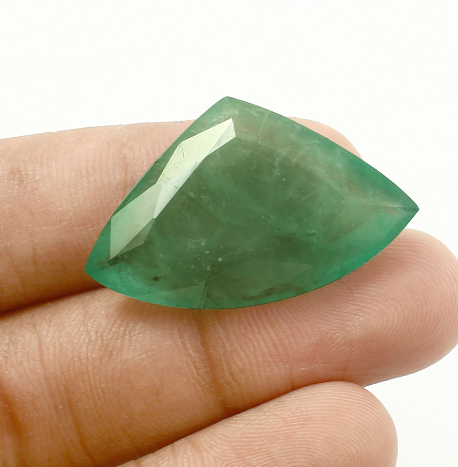 This 27.5 carat Emerald is light green in colour and has a diamond cut. The stone identifies Zambia, an African country, as its origin. The Fancy cut Zambian Emerald is typically considered to be the most attractive emerald shape. They stand out greatly in terms of both general appearance and the type of optics they create. When compared to its step cut facet design, the common round brilliant and the countless varieties of the brilliant style shape have a completely distinct visual impact. In contrast to a diamond with exceptional cut, which will radiate fire, glitter, and attractiveness, a fancy cut diamond with excellent colour, clarity, and carat weight 20 mm x 32 mm x 7 mm will be lifeless and dull if it reflects only a small amount of light.