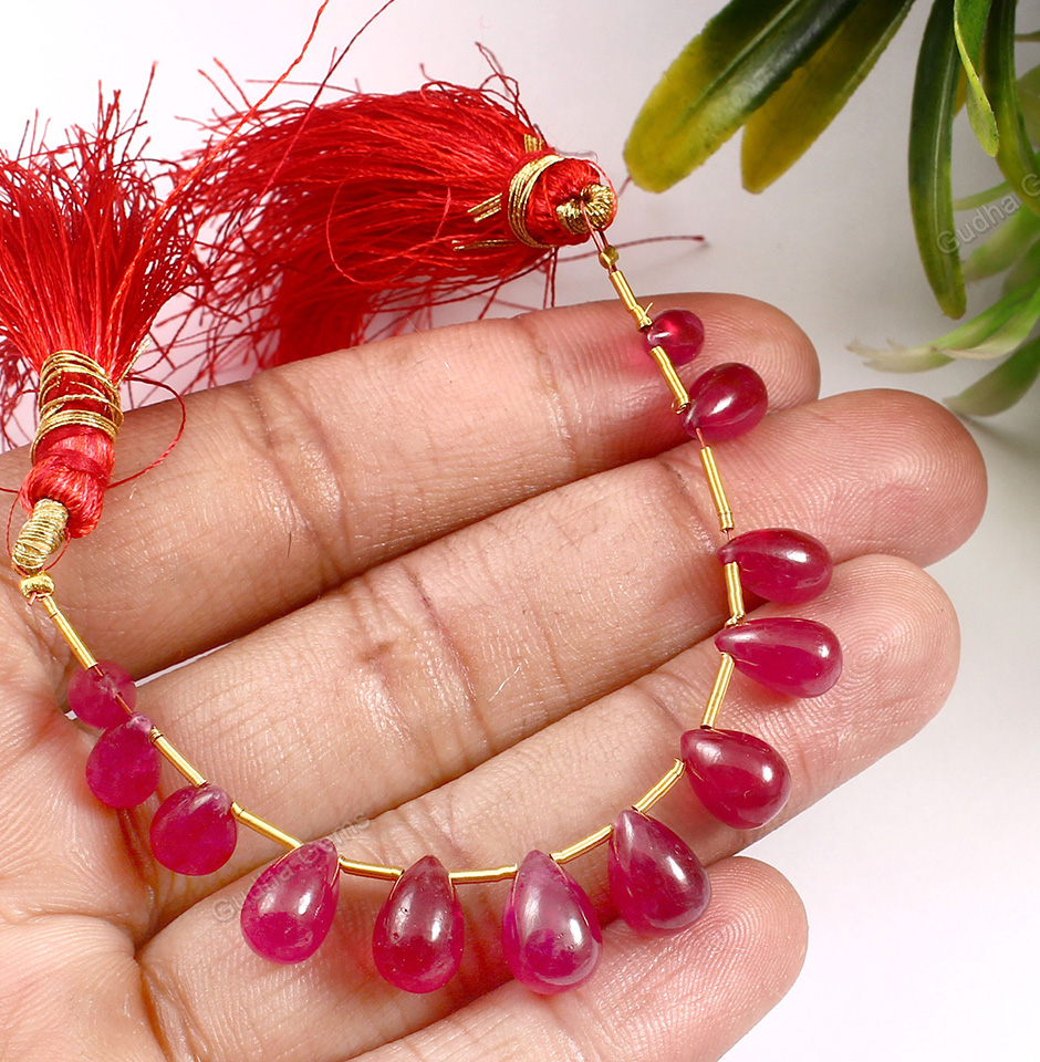 Ruby gemstones are priceless stones that may enthral people and help to create amazement with their true beauty. Ruby gemstones are treasured for their purity and luck. The price is reasonable given that this stone is natural. In numerous cultures, rubies are seen as symbols of good fortune, love, and protection. The Fine Ruby Teardrop Beads are typically fully drilled, which makes it simple for you to add them to your designs by wire wrapping, adding to thread, or attaching to the right setting. These wine red Ruby teardrops beads of size 6mm to 10mm are originated from African mines.