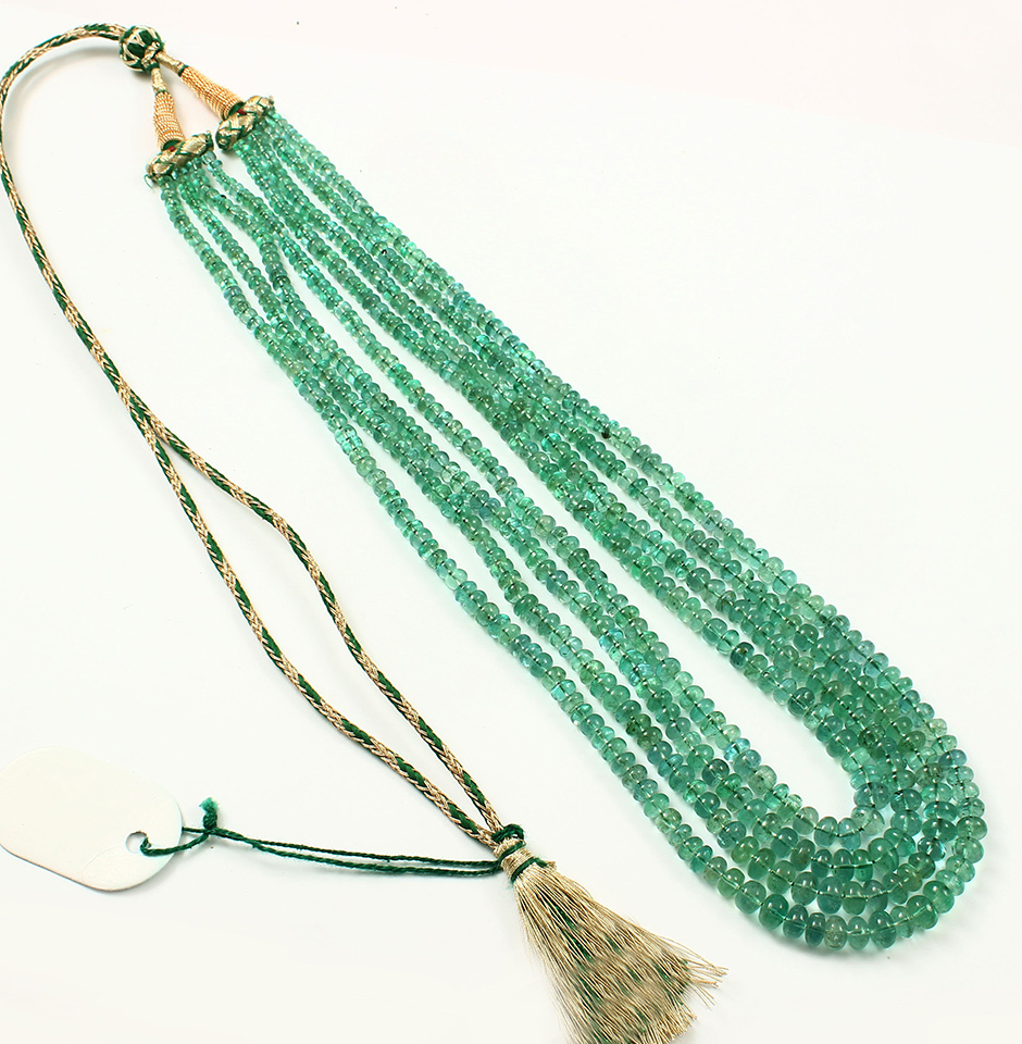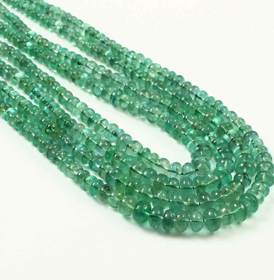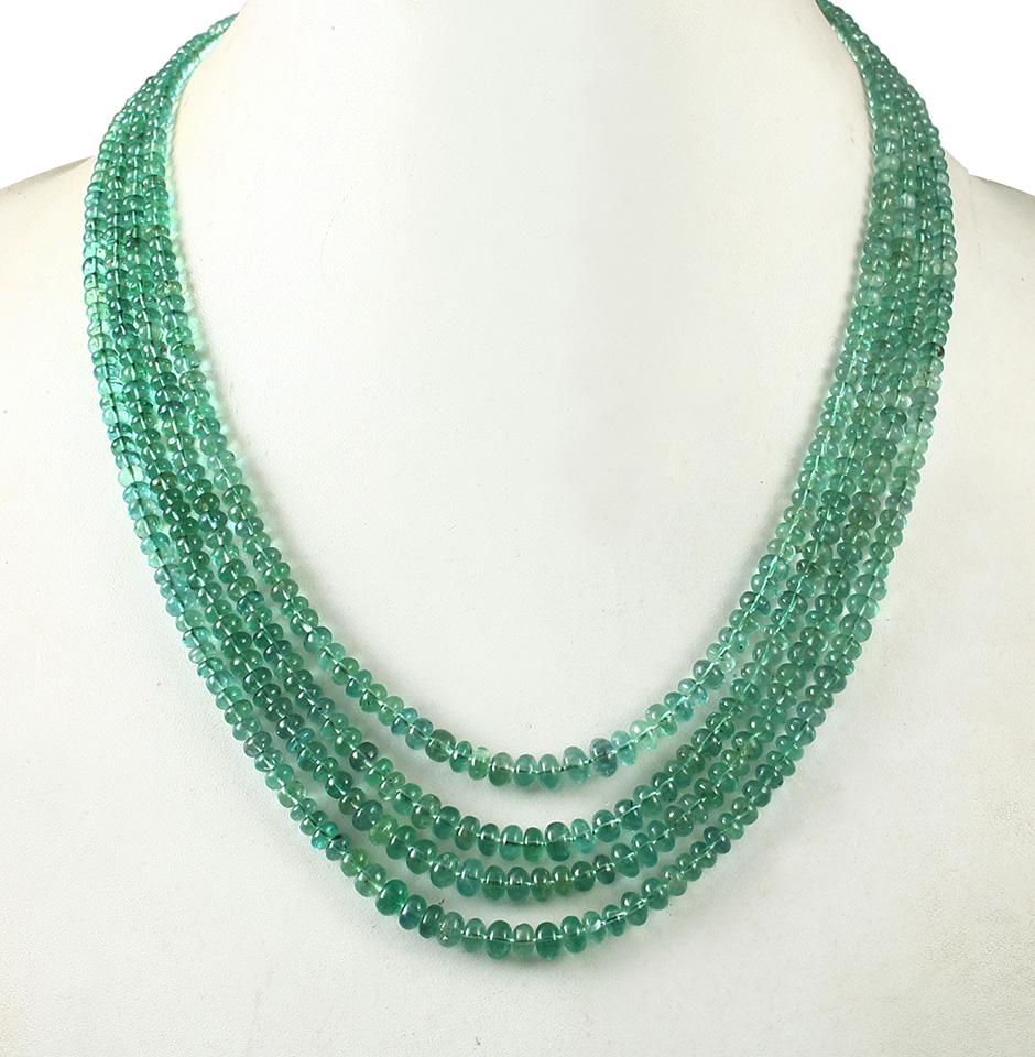 The diameters of these 274 carat Fine Zambia Emerald plain beads necklaces range from 4 mm to 5.5 mm. These round, smooth beads are made in the shape of an emerald, and Zambia is where emeralds are mined. It is thought to be the world's second-largest producer of fine emeralds. One of the major suppliers of emeralds of the highest quality is the zambian mines.