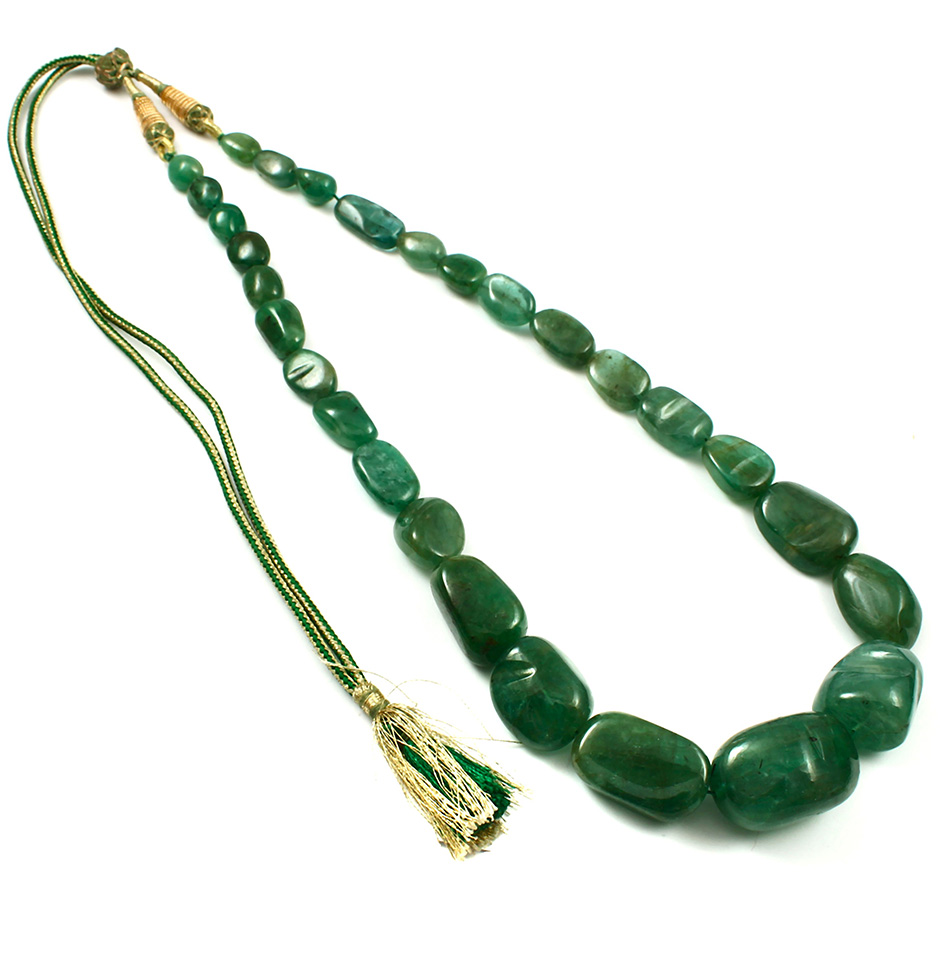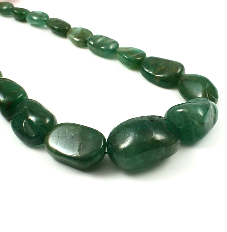 The Precious Emerald Tumbled Beads Necklace range in size from 11 mm to 30 mm. The beads are green in colour and have tumbled shape. Zambian mined stones were used to make the beads. The makers of these beads have meticulously crafted them by hand. Everything is cut and shaped, down to the minute details of the beads, which showcases the extraordinary amount of labour that was put into crafting it. As a top wholesaler of gemstones in Jaipur, we provide top-notch products. We accept smaller orders as well as larger ones, though we prefer bigger purchases. Our company's fundamental tenet is "meeting client demands and thoroughly fulfilling client requests." Emerald jewellery is best washed with warm, soapy water or a warm, soapy cloth. Never submerge emeralds in soapy water or use strong detergents that can dilute or remove oils from the stone.