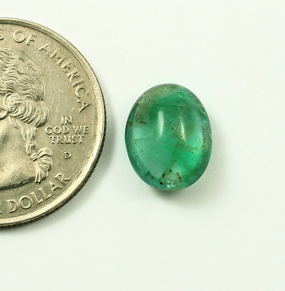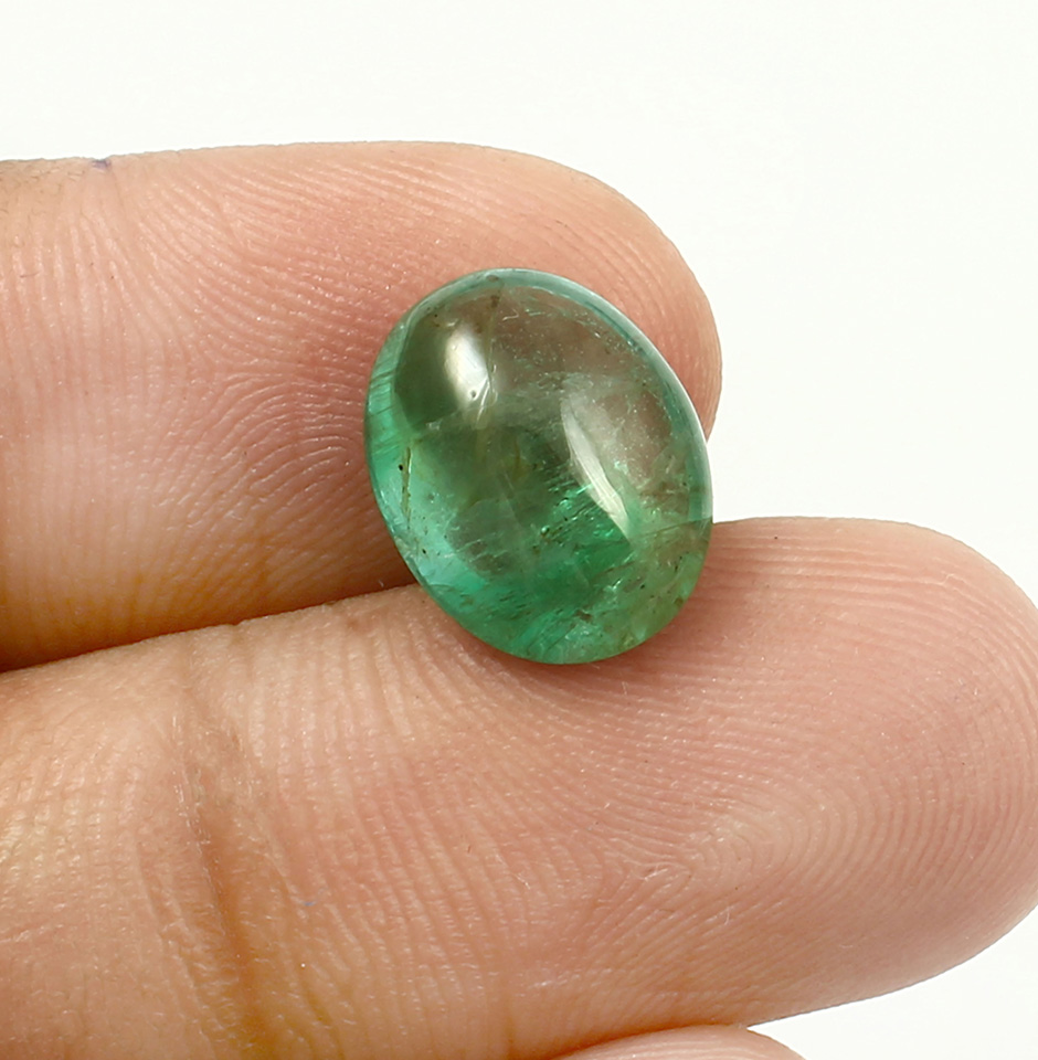 This precious oval Shape Emerald Cabochon is lustrous green and is 11 mm by 6 mm by 3.5 mm. These oval emerald cabochons weighing 5.5 carats were discovered in zambian mines. A classic cabochon cut is distinguished by a domed top. Even though the bottom of emerald cabochons is usually curved, it isn't always the case because it can occasionally be flat. Depending on how the individual gem works, the bottom may occasionally also be flat or may occasionally curve similarly to the top. The most common reason an emerald is cut into a cabochon is to be more gentle on internal fissures in the emerald during cutting and polishing.