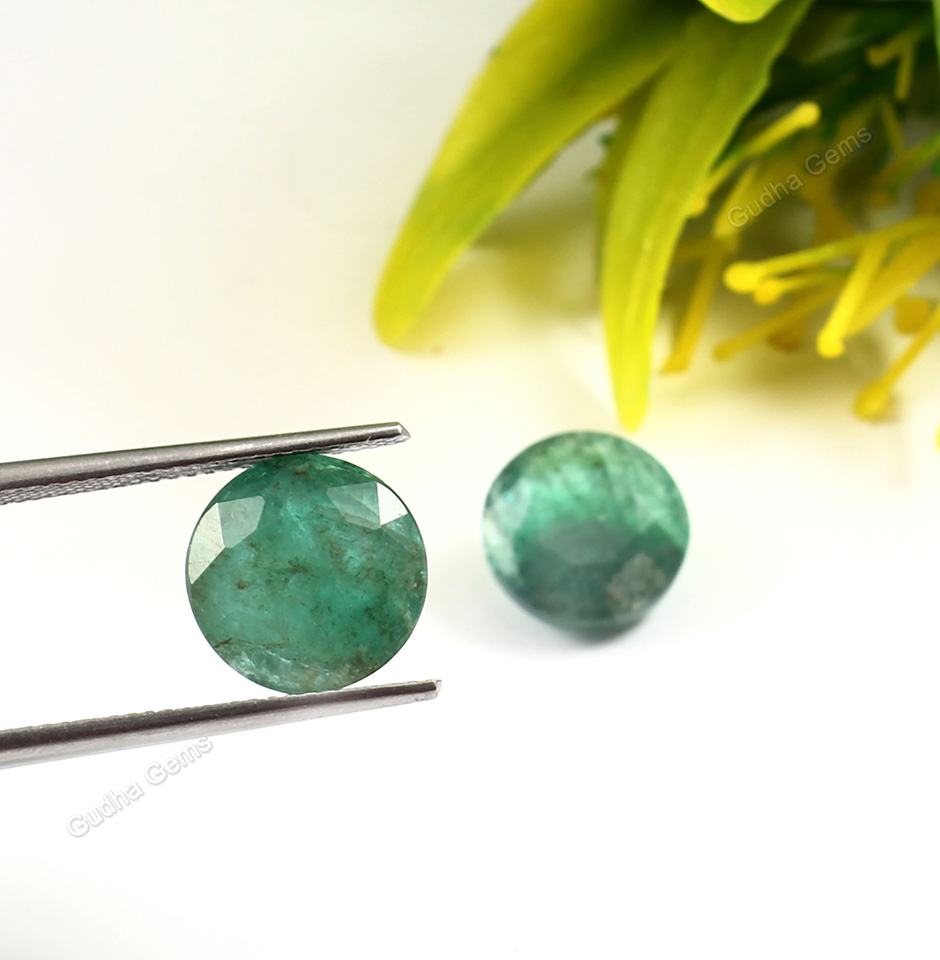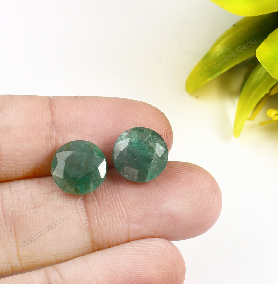 Introducing the Vintage Emerald Round Cut Pair from Zambia, exclusively offered by Gudha Gems Company,Best wholesale Gemstone(Ruby/Sapphire/Coral) supplier in Jaipur.These stunning gemstones are mined from the lush green hills of Zambia, known for producing some of the finest emeralds in the world. With a combined carat weight of 12 carats, this pair of emeralds is a rare find and a must-have for any gemstone collector. The colour of these emeralds is an enchanting included green, which is a signature hue of Zambian emeralds. The deep green colour is accentuated by the round cut of the gems. Measuring at 11 mm x 5 mm, these emeralds are a substantial size that is sure to catch the eye. The round cut also enhances their size, making them appear larger than they actually are.