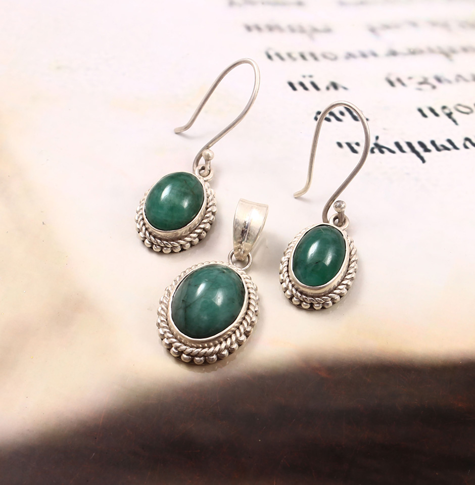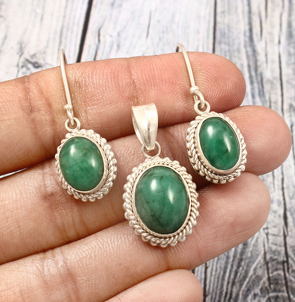 Introducing the Zambian Emerald Jewelry Set, an exquisite creation by Gudha Gems, designed to make you stand out from the crowd. With a carat weight of 55, this set is an epitome of elegance, luxury, and style. The jewellery set is crafted with precision and features a beautiful oval-shaped Zambian Emerald, which has a stunning green colour and is set in silver.The Zambian Emerald is sourced directly from Zambia, which is known for producing some of the best emeralds in the world. The emerald's green colour is vivid and vibrant, giving the jewellery set a regal and sophisticated look. The emerald is cut to perfection and measures 14x10x6 mm (approx.), which makes it a statement piece that is sure to catch everyone's attention.