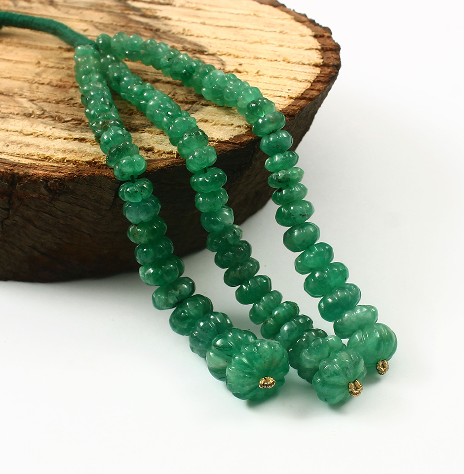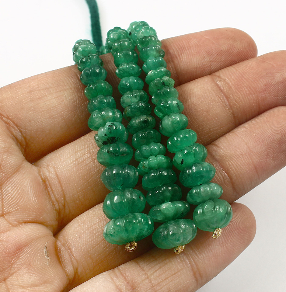 Introducing the stunning Zambian Emerald Pumpkin Beads, now available exclusively at Gudha Gems Company. This bunch of beads boasts a total carat weight of 145, making it a luxurious addition to any jewelry collection.These beads are crafted from the finest quality Zambian emeralds, prized for their deep, rich green color and remarkable clarity. The green color of the emerald is truly one of a kind, adding a vibrant pop of color to any piece of jewelry.